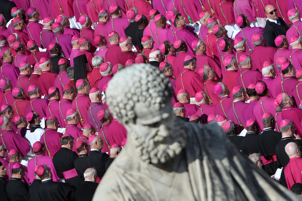 Các Đức giám mục đứng dưới bức tượng Thánh Peter trong lễ đăng quang của ĐGH Francis tại Vatican.